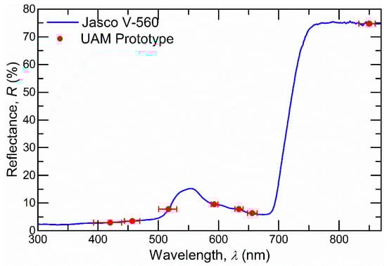 Reflectance spectrum of a leaf obtained using a JASCO V-560 spectrophotometer, together with the reflectance obtained using our prototype for the bands considered.