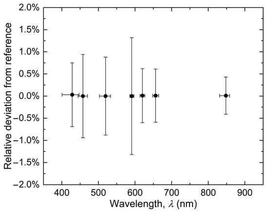 Mean and standard deviation of the deviation from reference for each of the seven bands considered. The horizontal error bars represent the width at half maximum of the emission spectrum of each LED. The standard deviation was considered as the inaccuracy value of each band.