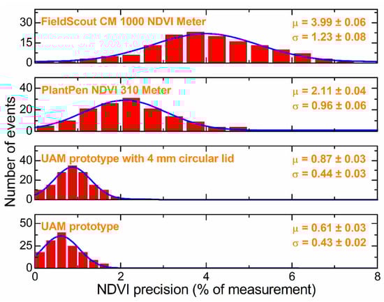 Figure 6 shows a histogram of the standard deviation of each series of ten NDVI measurements performed on each of the samples with each device. The value of the central point of a Gaussian fit to each histogram was taken as the average precision of that device.