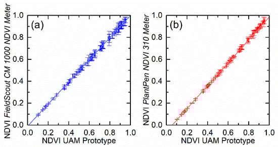 NDVI value obtained with the commercial instruments (a) FieldScout CM 1000 NDVI Meter and (b) PlantPen NDVI 310 Meter, in relation to the NDVI value obtained with our prototype. A linear fit was performed. Error bars represent the standard deviation between measurements.