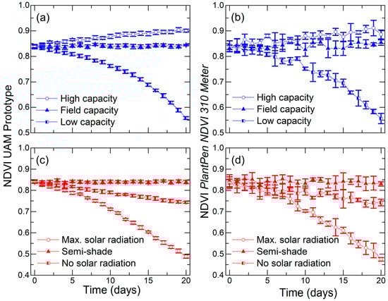 Evolution of the foliar NDVI index of Alocasia odora plants when the conditions of (a,b) watering and (c,d) exposure to sunlight were modified. The results obtained with (a,c) our prototype and with (b,d) the commercial device PlantPen NDVI 310 Meter are shown. The vertical error bars represent the deviation between the various measurements made.