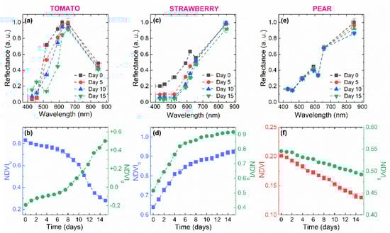 Reflectance spectrum of (a) round tomato, (c) strawberry, and (e) conference pear on the day the experiment was started, and five, ten, and fifteen days later. Evolution of different vegetation indices for (b) round tomato, (d) strawberry, and (f) conference pear as a function of the days elapsed since the start of the experiment.