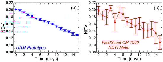 Evolution of the NDVI of conference pear as a function of the number of days elapsed since the beginning of the experiment. The results obtained with (a) our prototype and with (b) the commercial device FieldScout CM 1000 NDVI Meter are shown. The vertical error bars represent the deviation between the various measurements made.