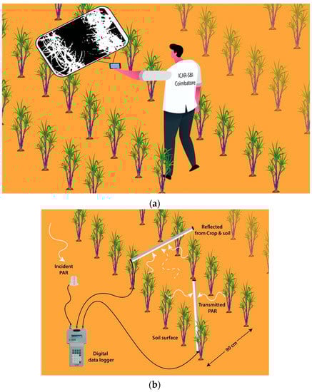 (a) Representative figure of measuring canopy coverage in a sugarcane field. (b) Representative figure of measuring light interception in a sugarcane field.