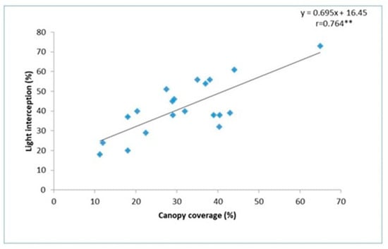 The traditional light interception method for determining canopy coverage using a line quantum sensor also had a significant positive correlation (r = 0.764 **) with canopy coverage captured through Canopeo; thus, our results signify the importance of canopy coverage determination by Canopeo in a rapid, non-destructive way and low-cost way.