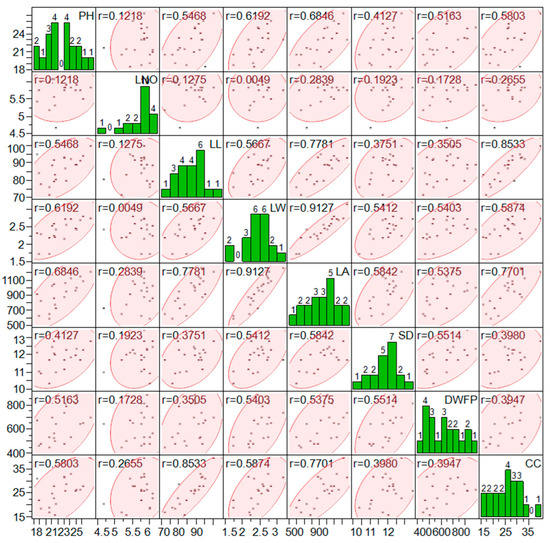 Scatterplot matrix showing the correlation, frequency counts among the studied parameter, i.e., canopy coverage % (CC), dry biomass at formative phase (DWFP), shoot diameter (SD), leaf area (3rd top visible dewlap) (LAI), leaf area (cm2) (LA2), leaf width (cm) (LW), leaf length (cm) (LL), leaf number (L.No), and plant height (PH).