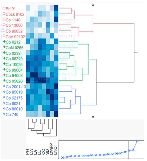 Two-way cluster analysis showing the grouping of sugarcane clones with the studied parameter is shown in Figure 5. The results revealed three distinct clusters: Cluster I: BO 91, CoLk 8102, Co 1148, Co 13006, Co 86032, and CoV 92102; Cluster II: Co 0212, CoM 0265, Co 0238, Co 86249, Co 10026, Co 99004, Co 94008, and Co 95020; and Cluster III: Co 2001-13, Co 85019, Co 62175, Co 86010, Co 8021, and Co 740. Among the three clusters, Cluster I was recorded as relatively lesser in plant height (20.33 cm), leaf number (5.49), leaf length (78.9 cm), leaf width (2.1 cm), total leaf area (695 cm2), shoot diameter (11.2 mm), dry biomass (510 g dry-weight m−2), and canopy coverage (18%), while Cluster II was observed with better plant height (23.64 cm), leaf length (94 cm), leaf width (2.65 cm), total leaf area (1085 cm2), and canopy coverage (31%). Cluster III was recorded with better leaf number, dry biomass, and shoot thickness among the studied parameters.