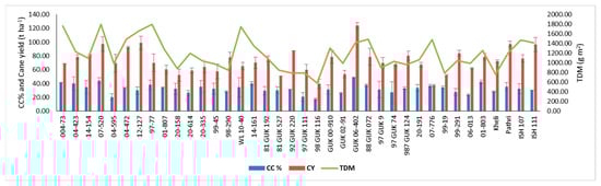 The mean, minimum, and maximum cane yield in sugarcane clones (improved breeding population, interspecific hybrid, and basic germplasm) were 72.4, 37.3, and 123.8 (t/ha). Among the studied clones, 07-520, 12-127, GUK 06-402, 987GUK 124, 99-291, Pathri, and ISH 111 recorded better cane yield compared to other clones (Figure 6).