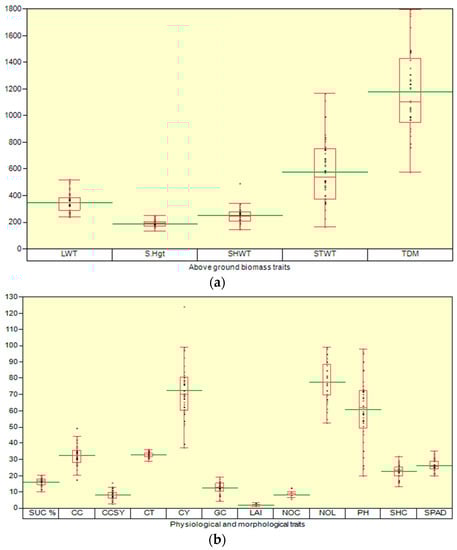 (a) Box plot displaying (upper quartile, lower quartile, median, upper extreme, lower extreme, whisker, outlier, and mean (horizontal green line) and the distribution of the dry matter partitioning LWT: leaf weight, SHWT: stem weight: STWT, and TDM: total dry matter (g .dwt.m−2) ratios) and S.Hgt: shoot height (cm). (b) Box plot displaying the distribution of the SUC%: Juice sucrose, CC: Canopy cover (%), CCSY: commercial cane sucrose (ton/ha), CT: Canopy temperature (°C) CY: cane yield (ton/ha), GC: germination count/row, LAI: leaf area index, NOC: number of canes/row, NOL: Number of leaves, SHC: shoot count/row, and SPAD: Soil Plant Analysis Development ratios. (c) Box plot displaying the distribution of the physiological (CFL: Chlorophyll fluorescence and TC: total chlorophyll content mg·cm−2 ratios). (d) Thermal image displaying the canopy temperature (°C) sugarcane crop.