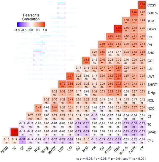 Correlation between various physiological and morphological traits with yield, viz., SPAD, TC:total chlorophyll (mg/cm2), CT: Canopy temperature (°C), NOC: number of canes/row, NOL: number of leaves, S.Hgt: shoot height (cm) at final stage, SHWT: Sheath weight (g.m−2), LWT: leaf dry weight (g.m−2), LAI: Leaf area index, GC: germination count, SHC: shoot count-early stage, PH: plant height at early stage (cm), CC: canopy coverage (%), STWT: stalk weight (g.m−2), TDM: total above-ground dry matter (g.m−2), SUC%: Juice sucrose%, CCSY: Commercial cane sugar (t ha−1), and CY: Cane yield (t ha−1), *** denotes p < 0.001, ** denotes p < 0.01; * denotes p < 0.05; and ns denotes non-significant p ≥ 0.05. The intensity of the colour indicates the strength of the correlation.