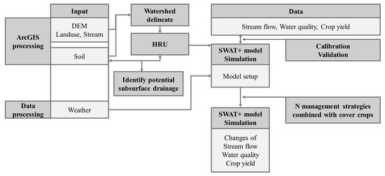 Figure 2 shows the overall study flow of the research. In this study, a SWAT+ model was adopted to explore the long-term effect of the N management strategies combined with cover crops.