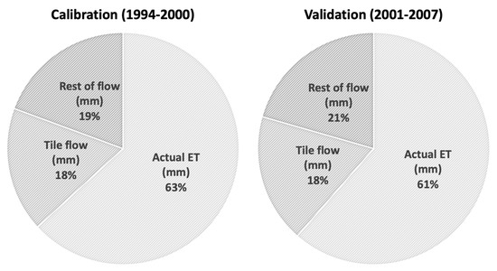 The model’s default tile drainage configuration (tile depth of 1.1 m and spacing of 20 m) was used in this study. The other tile drainage parameters, such as the multiplication factor for tile lateral saturated hydraulic conductivity (tile_latk) and tile lag time (tile_lag), were adjusted during the calibration process. The model simulated an average tile flow of 189 mm over a period of 14 years (1994–2007). This accounts for approximately 18% of the average annual precipitation. The model-simulated tile drain flow was found to be within the reasonable range for tile-dominated agricultural watersheds. Past field and watershed-scale studies of this region have shown partitioning of rainfall to tile drainage at a level of up to 39% [13,15,16,50]. The other hydrologic components simulated with the model, such as overland surface runoff and lateral flow, account for only a small percentage of the average annual rainfall. A summary of the model-simulated hydrologic components and water balance is presented in Figure 3 and Table S3.