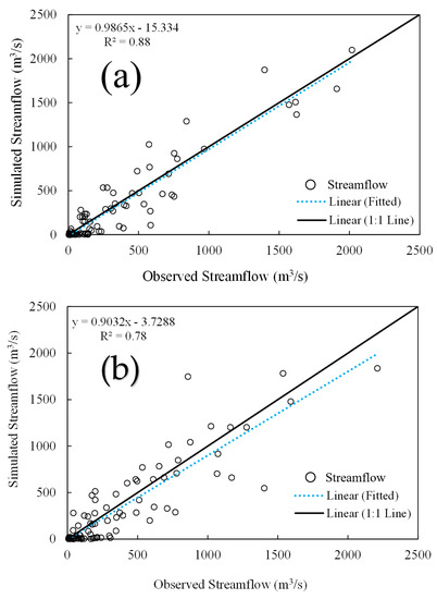 The model-simulated monthly streamflow was compared with the observed streamflow values during the calibration (1994–2000) and validation (2001–2007) processes. For a graphical evaluation, a scatterplot was used for the model’s evaluation in the calibration and validation periods (Figure 4). The comparison of the observed streamflow and model-simulated streamflow showed that model underpredicted the streamflow during both the calibration and validation periods. The scatterplot shows that most of the observed and predicted values are along the linear fitted line, with very few outliers in the validation period. The scatterplot shows that the model was able to capture both low and high streamflow events well.
