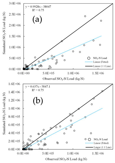 Following the hydrologic calibration, the model was calibrated simultaneously for both the riverine nitrate (NO3-N) load and crop yield. The simultaneous calibration of the crop yield and NO3-N is important because nutrient uptake by plants is one of the critical components of soil nutrient dynamics, which greatly influences the model’s performance in simulating NO3-N transport. Four model parameters were adjusted during the NO3-N calibration process, and three were adjusted during crop yield calibration (Table S2). The rate factors for the humus mineralization of active organic nutrients (cmn) and denitrification exponential rate coefficient (cdn) were found to be very sensitive in the NO3-N simulations. On the monthly scale, the model performed very well during the calibration period, with as NSE of 0.66, R-square of 0.75, and PBIAS of −14.5%. The model validation results showed a good model performance, with an NSE of 0.63, R-square of 0.75, and PBIAS of −37.9% (Table 3). The simulated results showed that the majority of the NO3-N in the water is channeled through the tile drainage route to the stream. Since the N fertilizers applied to the crops are highly dissolvable in water, tile drainage provides a preferential pathway for the transport of NO3-N from the soil to the surface water bodies. The scatterplot for the comparison of the monthly observed and simulated NO3-N for both the calibration and validation periods showed that the model underpredicted the NO3-N loads in the stream water (Figure 5). Although the model was able to capture the majority of the variability in the observed values, this finding suggests that the model was unable to capture some of the peak events, mainly those in the validation years.