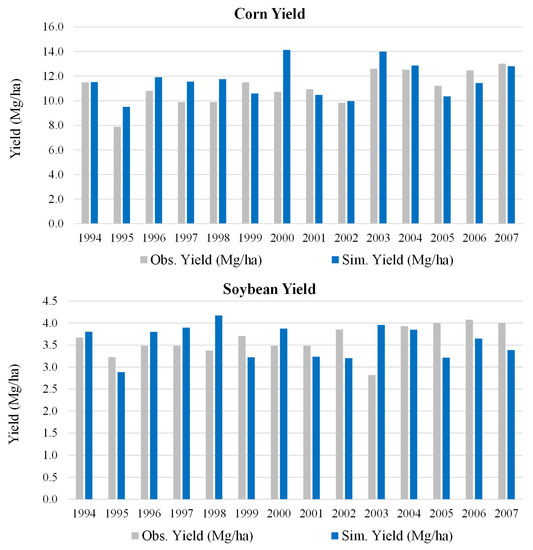 Comparison of model-simulated corn and soybean yields for both the calibration and validation periods, from 1994–2007.