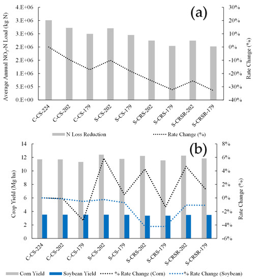 Moreover, the planting of a winter cover crop after corn harvesting and the termination of the cover crop before the planting of soybean, combined with a 20% N rate reduction and split N application (S-CRS-179), will further reduce the NO3-N load by 32%, the corn yield by 1%, and the soybean yield by 4%. The reduction in the crop yield might be associated with a delay in cover crop termination. The timely termination of the cover crop is important for minimizing the impact on both the corn and soybean yields. Research studies have found that the delayed termination of cover crops can potentially reduce crop yield [52]. The model simulation results also showed that the adoption of a cover crop in both the corn and soybean years does not further reduce the NO3-N loads compared to the adoption of a cover crop in the corn year alone.
