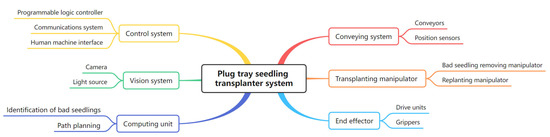 A plug tray seedling transplanter system consists of various components, including the end effectors, transplanting manipulator, conveying and positioning mechanism, visual system, and control system. The research of a tray seedling transplanting machine involves several stages. The first stage involves studying the physical properties of the seedling substrate to design and test the end effector. Next, the transplanting manipulator is designed according to the specific agronomic requirements. Finally, the entire machine is optimized to achieve all the necessary functions required for the transplanting operation. The system composition diagram of plug tray seedling transplanting machines for protected agriculture is depicted in Figure 2.