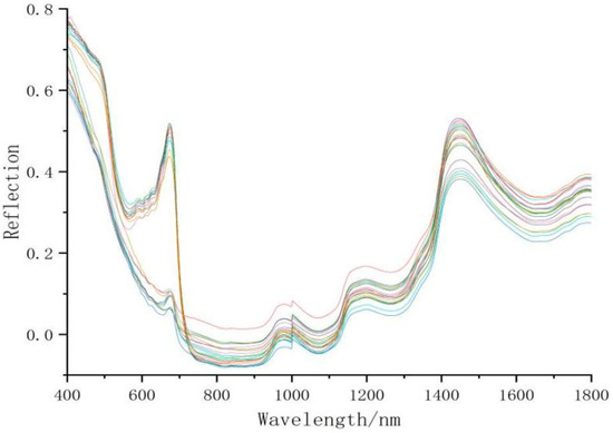 Figure 1 shows the preprocessed spectral data of some typical samples from the two pear varieties. As shown in Figure 1, the smoothing of spectral data not only removes the noise and unnecessary fluctuations but also retains the trends and features of the original data. It can also be found that the two varieties of samples have similar spectral curve variation trends throughout the entire spectral region, but there is a very significant reflection difference around 680 nm, mainly due to differences in skin reflection of different varieties of pears. Compared to ‘Cuiguan’ pears, ‘Huanghua’ pears have a yellower surface color and higher reflection in the spectral range of 600–700 nm. The negative reflection phenomenon of pears in the 700–1100 nm wavelength range may be related to the absorption of components and pigments in pears. For example, some components (such as moisture and sugar content) in the tissue and pigments (such as chlorophyll) in the pear skin can better absorb the light in the visible and short-wave NIR region.