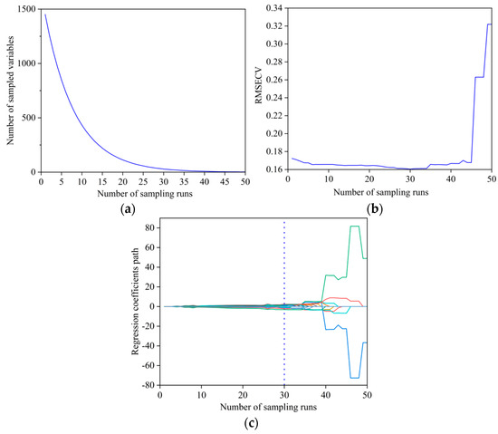 Variable extraction results by CARS. (a) Change trend of variables. (b) Change trend of RMSECV. (c) Path of regression coefficients.