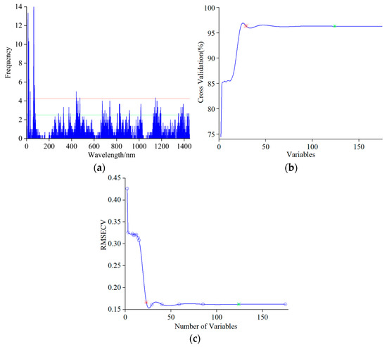 (1) Competitive adaptive reweighted sampling: The competitive adaptive reweighted sampling (CARS) algorithm is a method used for feature wavelength screening, and its basic idea is to select the optimal combination of wavelengths in the full spectrum by iterative competition [10,11,12,13]. Specifically, the CARS algorithm sequentially selects a subset of N wavelengths and uses an exponential decreasing function and adaptive reweighted sampling to determine the number of wavelengths selected for each sampling. Cross-validation is performed on each subset to calculate its minimum root mean square error of cross-validation, and the subset with the minimum RMSECV is selected as the optimal variable subset.