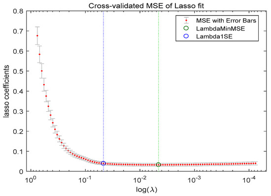 In the LASSO regression’s least residual sum of squares expression, λ is a hyperparameter that is a 1-paradigm penalty coefficient for the regression coefficient j to control the complexity of the model. λ values serve to penalize the feature coefficients so that some feature coefficients become 0 for feature selection. For each λ value, a coefficient matrix B on the regression coefficients j is obtained, where each column corresponds to a λ value. A series of λ values are used to train the LASSO regression model, and the optimal λ value is selected by k-fold cross-validation. The data set was divided into k subsets and we used k − 1 of them as the training set and the remaining subsets as the validation set each time, and then we calculated the performance of the model on the validation set and, finally, took the average value as the performance index of the model and selected the λ value with the minimum average MSE value as the optimal λ value. The optimization goal of LASSO regression is to minimize the sum of the absolute values of the regression coefficients. This enables the selection of features, i.e., the coefficients of some unimportant features are reduced or even become zero, thus simplifying the model and improving its generalization ability and interpretation.