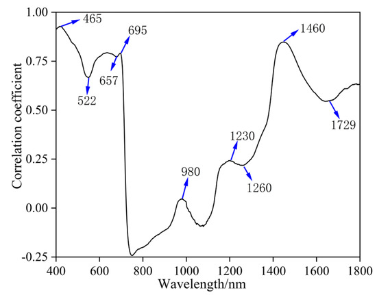 These chemical groups include O-H, C-H, C=O, C-O, and N-H. The types of compounds in which these groups are present in pear fruit include sugars, organic acids, amino acids, fatty acids, and polyphenols. Correlation analysis of the SSC with the spectra can determine which bands are related to the soluble solids content of pears, and a correlation coefficient plot can be used to obtain the characteristic wavelengths corresponding to the response spectra of the chemical groups of the SSC. The following Equation (2) was used to calculate the correlation coefficient between SSC and spectra [23].