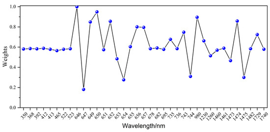 In this study, nine response spectra with high correlation with pear soluble solids were selected, and four of these wavelengths, namely 522 nm, 695 nm, 1460 nm, and 1729 nm, were consistent with the wavelengths selected by the LASSO algorithm, so the remaining five highly correlated wavelengths were fused with the thirty-three wavelengths selected by the LASSO algorithm to construct a wavelength set (containing thirty-eight wavelengths in total). Subsequently, each wavelength was considered an independent characterization factor of pear soluble solids, and the results were analyzed by the weighted model as shown in Figure 6 (Note: weighting value is zero at a wavelength of 648 nm, so only 37 wavelengths are shown in Figure 6). A total of 37 characterization factors were correlated with pear soluble solids, and their weight values wj were in the range of 0.181–0.948.