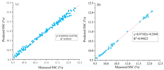 Measured vs. predicted values for SSC by LASSO–GWF–PLS model. (a) Correction set (b) Prediction set.
