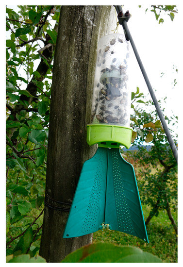 Different alternative trap designs and deployment strategies were developed and tested recently, e.g., a modified jar top pyramid, a pipe trap, a small black plastic pyramid (ground and canopy deployed), a small hanging pyramid and a delta trap [32,33,38] in order to find a simpler, less expensive and suitable replacement for the standard black pyramid trap.