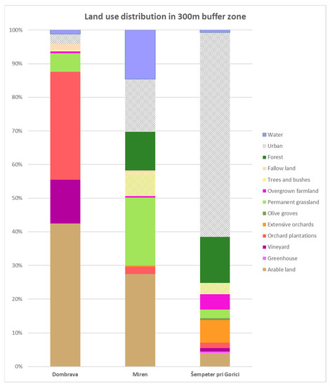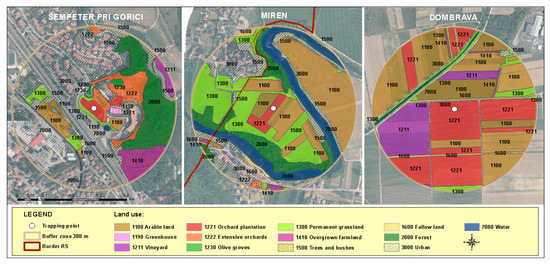 A 300 m radius buffer around trapping locations was calculated and covered with a land-use layer (Figure 4). As part of the buffer area around the trapping location in Miren intersects the territory of Italy, we performed a simple manual classification of land-use units based on DOF050—orthophoto [59] for this area. All data were then analysed using MS Access and MS Excel for further interpretation. Land use was classified into the following thirteen categories: arable land, orchard plantations, vineyard, greenhouse, extensive orchards, olive groves, permanent grassland, fallow land, overgrown farmland, trees and bushes, forests, urban land and water. We also calculated the Shannon diversity (H’) index to measure land cover heterogeneity based on the proportion of land cover types (in %) within the 300 m buffer zone [60].