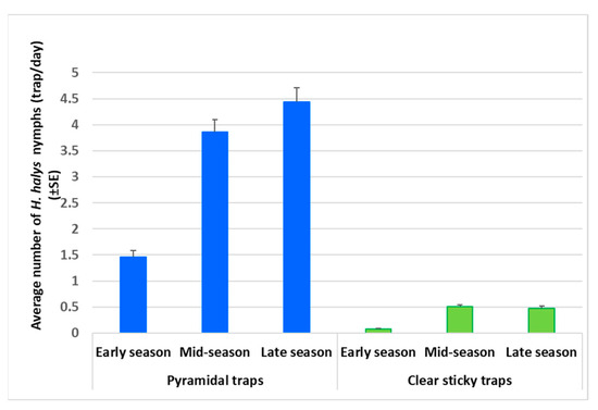 There were significant differences in the capture of adults (F = 27.11; df = 2; p = 0.01) and nymphs (F = 23.11, df = 2, p = 0.01) during the different sampling periods. Early-season captures of adults in traps were significantly lower compared to mid-season and late-season captures in both pyramid and clear sticky traps, while the mid-season and late-season captures were statistically equal for both trap types (Figure 5). The nymphs occurred in the mid and late seasons. Pyramid traps captured significantly more nymphs than clear sticky traps, and the mid- and late-season captures of nymphs in pyramid traps were statistically equal, and there were no differences between the season captures observed in clear sticky traps (Figure 6).