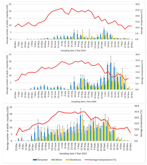 Seasonal occurrence of Halyomorpha halys adults in pyramidal Rescue® Stink Bug Traps in apple orchards (Šempeter, Miren, and Dombrava) in Goriška region during 2019–2021 in relation to average temperature.
