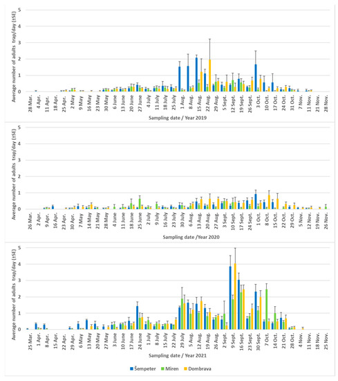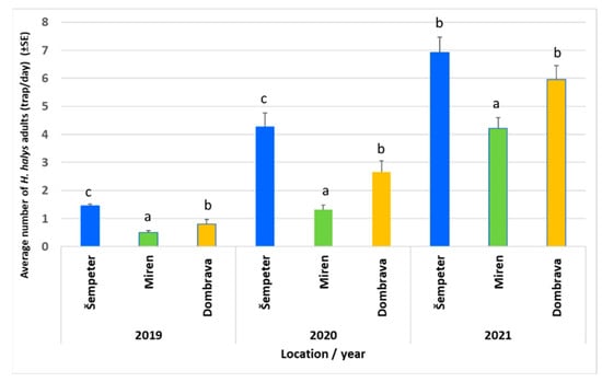 Comparison of average (±SE) number of Halyomorpha halys adults in apple orchards from different locations (Šempeter, Miren, and Dombrava) in Goriška region during 2019–2021. Means with the same letters within each year are not significantly different (p > 0.05 ANOVA followed by the Student–Newman–Keuls test).