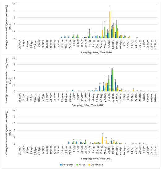 The trapping location affected the adult captures (F = 15.91, df = 2, p = 0.01) and nymphs (F = 43.29, df = 2, p = 0.01). Over all the study years, the highest average number of adults was recorded at location 1 (Šempeter).