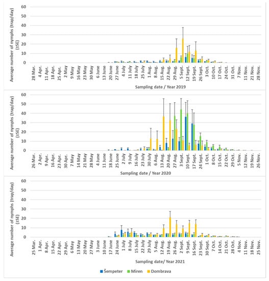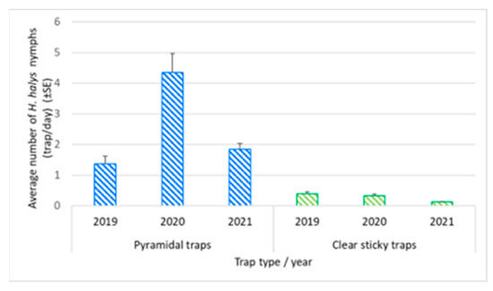 Comparison of the average number of Halyomorpha halys nymphs per day in clear sticky traps during the years 2019–2021.