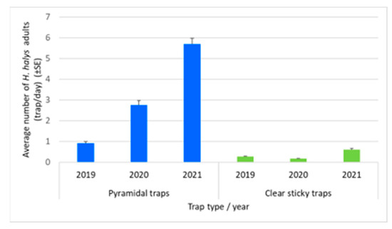 In addition to an increased H. halys captures in 2020, the difference in captures between traps was likely driven by a high amount of precipitation that could weaken the performance of the sticky traps. In the period from March to October 2020, two times more precipitation fell than in the same period in 2019 and 2021. The captures of H. halys adults in pyramid traps considerably increased in H. halys over a three-year period. In general, an increasing trend in captures was observed in clear sticky traps, but with a noticeable drop in 2020 (−36%), the reasons of which are already mentioned above.