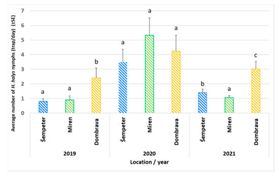 Comparison of average (±SE) number of Halyomorpha halys nymphs in apple orchards from different locations (Šempeter, Miren, and Dombrava) in Goriška region during 2019–2021. Means with the same letters within each year are not significantly different (p > 0.05 ANOVA followed by the Student–Newman–Keuls test).