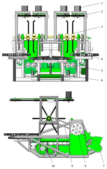 The directional clamping corn ear-breaking device is the header part of a corn combine harvester, mainly composed of a frame, a disc cutter device, a directional clamping mechanism, an ear-breaking mechanism, a stem-pulling mechanism, an ear collection mechanism, a transmission mechanism, etc. (Figure 1). When harvesting fresh corn, as the combine moves in opposite directions, the corn plant is continuously fed to the directional clamping conveying mechanism, which clamps the stem above the ears and delivers it to the breaking mechanism, and the ear breaking is completed under the action of ear-breaking rollers composed of a pair of six radial distribution function fingers. During the breaking process, the corn stalks were not cut, similar to the manual breaking process. The directional clamping mechanism played a role in supporting the breaking process. After the breaking operation was completed, the cutting knife cut the stalks, and the pulling roller squeezed the corn stalks to achieve continuous, stable production.