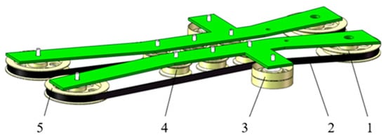 Structural diagram of directional clamping and conveying mechanism. 1. Active pulley. 2. Clamping belt. 3. Tensioning pulley. 4. Guide pulley. 5. Passive pulley.