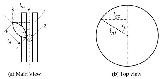 When the ear-breaking wheel is used for the ear-breaking operation, the growth direction of fresh corn ears has a significant impact on the ear-breaking effect of the ear-breaking finger. Therefore, the gap between the ear-breaking fingers must meet the requirement of producing ear-breaking force for fresh corn ears growing in different directions. During the ear-breaking operation, the corn stem is directionally clamped and fed into the gap between the ear-breaking fingers. As the diameter of the ear is smaller than the gap, the ear-breaking finger can apply the ear-breaking force to separate the ear from the stem from top to bottom. Due to the randomness of the direction between the ears and the gap between the ear-breaking wheel during the operation of the machine, there are several states where the angle between the ears axis and the ear-breaking finger axis appears, as illustrated in Figure 7.