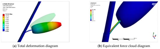 The fresh corn-clamping and breaking device designed in this article is fixed at both ends during the breaking operation, exerting a force on the ears. When bent to a certain extent, the ears are picked off; therefore, in finite element analysis, fresh corn plants are fixed and supported in both an up and down motion, and loads are added to the ears. According to the measurement of fresh corn ear-breaking force described in Section 2, the range of ear-breaking force is 36.8 to 72.4 N. Due to errors in experimental measurement, and based on the compressive strength data measured on the mechanical properties of corn ears, under the condition of meeting the compressive strength of corn ears with bracts, a force of 120 N is applied to the ears in a vertical downward direction. For the convenience of observation, the model style during deformation is retained in finite element analysis (by zooming in and out on the observed area). As shown in Figure 9a, there is a certain amount of deviation due to the thin upper stem of the spike. The stress cloud diagram of the connection between the fruit stem and the stem and ear after adding the load is shown in Figure 9b.
