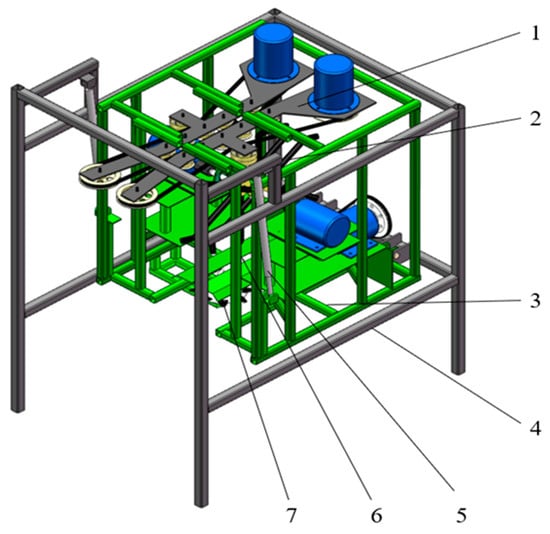 Structure diagram of the test bench for the fresh corn clamping and breaking device. 1. Directional clamping mechanism. 2. Ear picking mechanism. 3. Inner frame. 4. Outer frame. 5. Lifting push rod. 6. Stem pretreatment mechanism. 7. Cutting mechanism.
