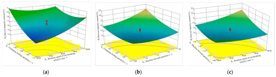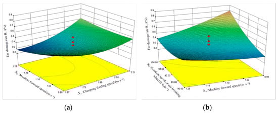 The experimental data were processed using Design Expert 8.0.6 data analysis software to obtain the significant and significant interaction between the clamping feeding speed X1, the rate of rotation X2 of the ear-breaking wheel, and the machine forward speed X3 on the yield impurity rate. The response surfaces of the experimental factor indicators are shown in Figure 16, respectively.
