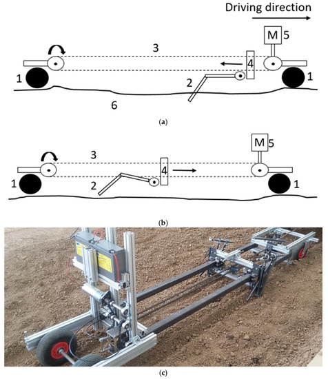 (a,b) The basic principle of the prototype to move forward described with two different positions of the spikes with mechanical components (1—wheels; 2—spikes; 3—chain; 4—slide; 5—motor; 6—soil) and (c) general overview of the setup.