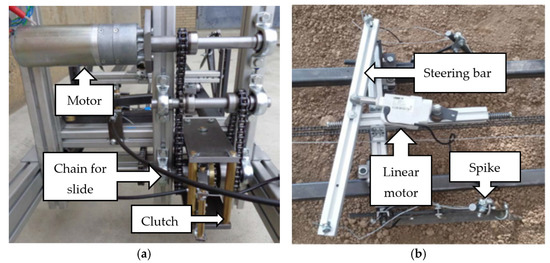 To create the necessary movement, a linear guide was built based on two tubular profiles. They held a chain that moved a slide over the linear guide. The chain was connected to a gearbox, which was connected to a basic DC electrical motor with a nominal power of 120 W (BCI-63.55, emb-papst GmbH, Mulfingen, Germany). The spikes were attached with joints to the moving slide, one at each side of the machine. To switch the direction of the slide movement, a completely mechanical solution was chosen to be more robust and to minimize the control requirement and electrical components of the machine. At each end of the linear guiding tubes for the slide, a mechanical feeler was attached, which used a Bowden cable to switch the mechanical clutch of the motor on both sides. The clutch enabled a mechanical direction switch, without the need to start and stop the motor (see Figure 2a). The whole width of the system was fixed to 0.55 m so that the system would be able to drive between crop rows in agricultural applications with a 0.75 m row width. To enable the steering of the vehicle, both spikes were connected to an iron cable (1 mm diameter), which was connected to a horizontal steering bar (see Figure 2b).