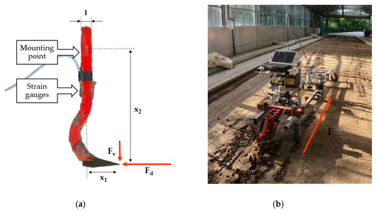 For the dynamic performance experiment, the applied forces were measured while the robot performed a conventional soil preparation task. The power consumption of the battery and output system of the motor controller was logged simultaneously. At the back of the robot, a hoe was attached to the robot frame. Linear 350 ohm DY41-1.5 strain gauges (HBM GmbH, Darmstadt, Germany), with two parallel measuring grids and a full-bridge configuration, were attached to the hoe to determine the vertical and horizontal forces acting on the hoe (Figure 5a). The hoe was connected to the robot frame using a conventional hoe parallelogram to achieve a constant working depth (Figure 5b).