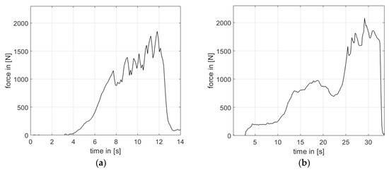 The results of the static measurements indicated that the vehicle generated high draft forces. Two trials were performed in two different locations in the soil bin. During the first trial, at maximum force, the soil failed such that the spikes broke loose and plowed through the soil. During the second trial, which was conducted under different soil conditions, the spikes failed such that they were bent backward and taken out of the soil. In both tests, as the power on the motor slowly increased, we observed an initial phase during which the robot needed some time to push the spikes into the soil. Afterward, the measured interaction force increased slowly. Our measurements indicate that this increase was not continuous but followed a wave pattern with small local peaks (see Figure 6a). Apparently, the force generated on the spikes dropped each time that either the soil failed or the spike penetrated deeper into the soil. The measured forces based on the three-axis load cell unit are shown in Figure 6.