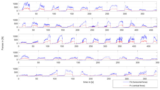 The maximum force reached in the dynamic test was in row 1 with 1335.3 N, resulting in an NTR of 1.48. The maximum mean value was reached in row 3 with 502.5 N. The forces needed in row 2, row 3, and row 5 were significantly lower because of less soil compaction in these areas. Similar to the horizontal forces, the vertical forces were also the highest in row 1 with 461.7 N, and the mean value was the highest in row 3 with 172.7 N. The mean energy input Ein correlated with the force input, as high forces logically need more motor power to move forward. The mean input energy values varied between 65.1 W and 54.2 W for the five rows. With standard deviations below 37.7 W, the consumption of the vehicle just had some small peaks and reached the highest energy peak of 316.8 W in row 1. The ratio was, on average, between 0.1 and 0.17 for the five rows, including the idle time when the slide was moving back to the start position. The time it took to cover 10 m varied between a maximum of 478 s in row 3 and a minimum of 349 s in row 4. The time-specific results of all five trials for the horizontal and vertical forces can be found in Figure 7.