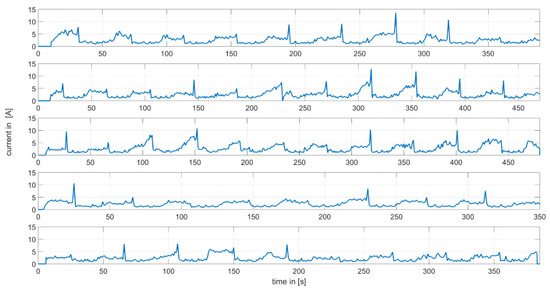 Motor current consumption (A) dependent on time for the five dynamic measurements.