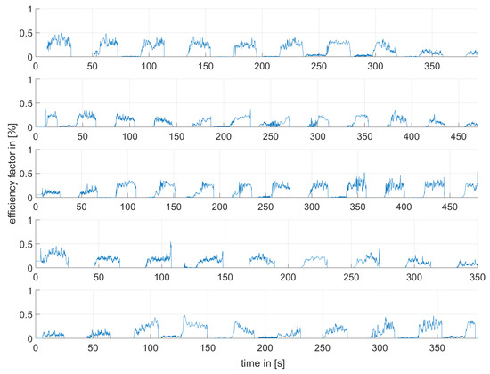 While the vehicle was pulling the tool, we observed an efficiency factor of up to 0.54. Low slip rates increased the efficiency (see also Table 1). For the five rows, the maximum values reached between 0.37 and 0.54. The best mean performance was achieved in line 1 and line 4. The worst result was reached in line 2. It seems that high efficiency is dependent on the forces developed. Especially for areas with small operation resistance, the EER dropped, leading to the assumption that the machine needs resistance and good machine utilization to perform effectively. The overall mean EER measured was 0.14. However, the peaks of the EER promise high improvement potentials, up to a value of 0.5.